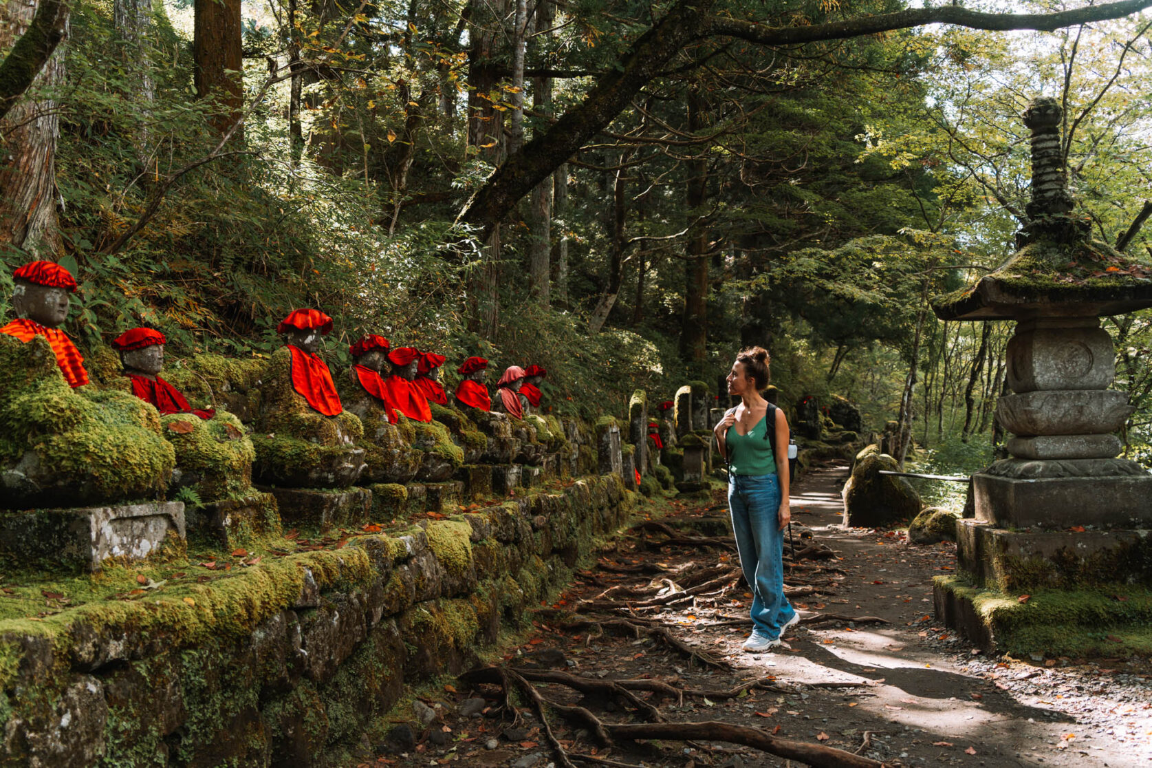 Kanmangafuchi Abyss is een smalle kloof waar rivier de Daiya tussen een bos met donkere lavastenen stroomt. Het bijzondere aan deze plek zijn de 70 Jizo-beelden langs de route, de boeddhistische beschermers van kinderen en reizigers. De rode mutsjes en sjaaltjes die locals de beelden omdoen, vormen een mooi contrast met het groene mos. Volgens de legende veranderen de beelden elke keer in aantal en volgorde wanneer je ze probeert te tellen.